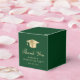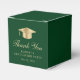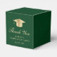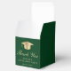 Caixa de lembrança de festa de formatura verde elegante com um chapéu de graduado dourado, "Obrigado" em uma fonte dourada clássica e o nome do graduado e data da festa em tipografia dourada moderna.