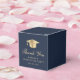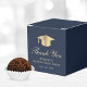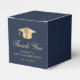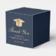 Caixa de lembrança de festa de graduação azul escuro elegante com um chapéu de graduado dourado, "Obrigado" em uma fonte dourada clássica e o nome do graduado e data da festa em tipografia dourada clara moderna.
