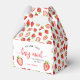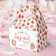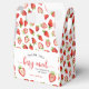 Caixa de favorecimento de festa de aniversário do tema do morango em branco com ilustração de cor d'água da fruta vermelha de verão. O texto diz "obrigado que você morda muito por vir à minha festa." Perfeito para uma festa de menina no verão.
