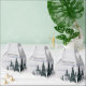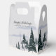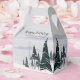 Uma adorável cena de inverno de uma floresta coberta de neve de abetos e pinheiros verde-escuros e um céu cinza-claro decora esta caixa de lembranças de festa de fim de ano para um casamento ou gala de Natal. Este desenho moderno de uma paisagem natural nevada é perfeito para um evento noturno em dezembro ou janeiro.