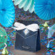 Um fundo de aquarela em tons de azul real a marinho é tocado por um abstrato de linhas de ouro finas e efeitos luminosos brilhantes para criar as peças desta bela suíte de casamento. A caixa de favoritos do casamento 'Obrigado' mostrada aqui também apresenta um quadro gradiente em forma de diamante para segurar as iniciais da noiva e do noivo e a data do casamento. Adicione uma mensagem de obrigado pessoal usando o modelo fornecido. Procure ID867 para ver outras peças e opções de cores para este conjunto.