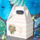 Uma pequena caixa de favor com uma imagem fofa. Flores azuis, rosa e creme com folhas verdes. Colocadas dentro de um vaso de flores verde com um pano xadrez verde pendurado na lateral.