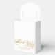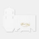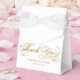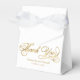 Uma caixa de favoritos de casamento com um fundo branco com as palavras "Obrigado" em folha de ouro falsa e espaço para os nomes e a data de casamento da noiva e do noivo.