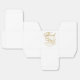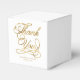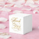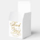 Uma caixa de favoritos de casamento com um fundo branco com as palavras "Obrigado" em folha de ouro falsa e espaço para os nomes e a data de casamento da noiva e do noivo.