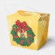 Este lindo pedaço vestindo um chapéu de Papai Noel está saindo atrás de uma coroa de Natal verde envolta com fita vermelha e dourada e um grande arco vermelho para celebrar o feriado.