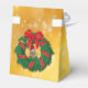 Este lindo pedaço vestindo um chapéu de Papai Noel está saindo atrás de uma coroa de Natal verde envolta com fita vermelha e dourada e um grande arco vermelho para celebrar o feriado.