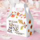 Um filhote de lobo giro e fofo selvagem, uma floresta, festa de aniversário a caixa de presentes com folhas de queda castanhas, bom para a festa do inverno do outono.