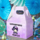 Adicione um nome a essas caixas de favoritos personalizadas da Festa de aniversário de anime roxo e preta.