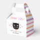Estas caixas de favores divertidos apresentam um gato preto desenhado à mão com sotaques pastéis, junto com estrelas, listras e a moderna tipografia multicolorida lendo, "OBRIGADO." Os tons de pastel rosa, roxo e pêssego se destacam em relação ao fundo branco. São incluídos dois modelos de texto para personalização simples! Excelente para a festa de aniversário inspirada no Halloween de uma garota! *Trabalho de arte de Orabella Impressões.
