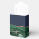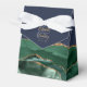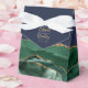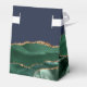 Esta elegante caixa de favores moderna apresenta uma esmeralda cor d'água verde agate design aparada com brilho dourado. Personalize-o com os nomes da noiva e do noivo em um guião de manuscrito dourado sobre um grande e azul marinho, juntamente com a data do casamento abaixo.