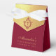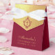 An elegant burgundy and gold favor box, for a girl's religious confirmation. The flap is faux gold foil and it has a crest with a cross in it, both of them burgundy (deep red).