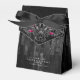 Esta coleção de casamento temática gótica e escura é adequada para qualquer época do ano, incluindo Dia dos Mortos, Dia de los muertos e Halloween. O conjunto apresenta crânios, escrollwork frames de ornamentado e flores exuberantes em preto e prata com sotaques arrojados. O trabalho de rolagem e as flores adornam esta caixa de favoritos design num fundo abstrato. Insira facilmente seus nomes e data de casamento para esta caixa de favoritos impressionante usando o modelo fornecido. Veja o link de coleção nesta página para ver todos os itens correspondentes neste conjunto bonito ou ID866 de pesquisa para ver opções de cor adicionais para este design.