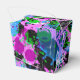 Estas caixas coloridas exibem um abstrato vivo em tons de turquesa, rosa, roxo, lavanda, travesseiro, verde, preto e branco.