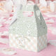 Esta é uma adorável caixa de primeiros aniversarios verde e laranja do Halloween, neutra em termos de gênero. O fundo apresenta um padrão bonito desenhado à mão de fantasmas, morcegos, estrelas e luas sobre um fundo verde pastel. A frente e o verso apresentam um fantasma giro em um padrão de gingham laranja e verde personalizado com nome e data.