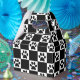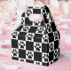 Design preto e branco com pegadas pretas nos quadrados brancos.