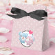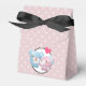 Favor de caixas com uma bela imagem de desenho animado de um casal de urso, o urso é rosa pastel com um arco pequeno e beija a bochecha de um urso azul que parece positivamente encantado. Um pequeno coração rosa está flutuando sobre suas cabeças. Muito fofo e kawaii. O padrão de fundo é uma cor rosa mutada com bolinhas brancas.