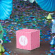 Feminine light pink and white design in the squiggly squares fractal. Add an initial for personalization for your party or event. Cube shaped favor box works for nearly all occasions.