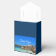 Uma caixa de favor com uma fotografia de uma praia azul-turquesa de oceano com rochas grandes espalhadas ao longo da costa. Local tropical brilhante e ensolarado.