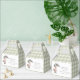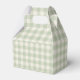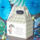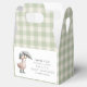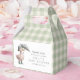 This charming favor box features a cute watercolor duckling dressed in sage green rain boots and hat, holding a gingham umbrella. The soft sage green gingham background wraps the entire box in cozy woodland charm, while the front panel includes a personalized thank you message for your guests.