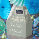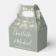 Caixa de lembrança de casamento elegante com luzes de corda bonitas, nomes em letra cursiva sofisticada e data especial em um fundo verde sage. Você pode personalizar com sua própria mensagem de agradecimento no verso. Uma maneira perfeita de dizer obrigado aos seus convidados! Criado por Thisisnotme©