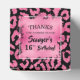 Caixas de favoritos quadrados do padrão de impressão leopardo rosa e preto de 2" apresentam a sua obrigado que você envia em folha azul no topo em letra chic. Bonita para caixas de festa de aniversário e muito mais. CORRESPONDENDO a itens na nossa loja.