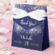 Uma elegante e glamourosa caixa de adoração azul e branca de 21 ruas (ou qualquer idade). Um fundo colorido de marinho escuro com pó falso de cinza prateada. A cor azul é irregular. Com o texto: Obrigado! Modelos de nome, data de nascimento e data de aniversário e número de idade. Cartas brancas.