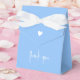 Um saco azul elegante minimalista para chá de bebê favoritos com gravata de fita. Apresentando uma fonte moderna e um pequeno coração branco que pode ser personalizado com seu próprio nome e data no verso. Nota: a fonte não é editável a não ser sua cor