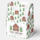 Gingerbread house-themed Christmas favor boxes with a charming gingerbread house flanked by two gingerbread trees decorated with white, green, and red frosting. The perfect gift box for your home-baked gingerbread cookies you're giving to friends and relatives as gifts this holiday season.
