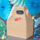 A minimalist favor box featuring a bold red lipstick kiss on a natural cardboard background.