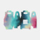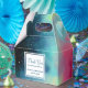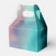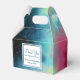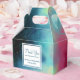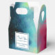 Uma caixa personalizada de favores de casamento com um design legal e na moda. As aquarelas se misturam e se misturam para criar a ilusão de uma imagem espacial. Verde com espirais de púrpura, amarela e vermelho-claro misturados com uma mistura de pontos brancos e estrelas. Uma legal criação de triquetes. Um quadrado branco em camadas acima com seu dentro de texto.