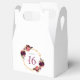 Elegante e glamouroso para a 16ª festa de aniversário. Frente e verso: fundo branco chic com uma falso estrutura geométrica dourada. Decorados com flores roxas escuras e burgueiras, rosas e penas do estilo "boho". O nome é escrito com um script de estilo manuscrito cor-de-rosa. A data é escrita com números negros e 16 anos em burgundy