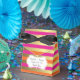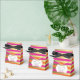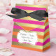 Um obrigado de casamento você favorece bolsa com um padrão elegante composto de listras horizontais, cor-de-rosa, laranja e escura, metálicas douradas. Camadas sobre o topo é um quadro branco rico personalizado com a noiva e os nomes dos noivos, data do casamento e obrigado você.