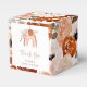 Estas adoráveis caixas de favorecimento de chás de fraldas apresentam estilo de vassoura de tendências e um roteiro manuscrito de tendências que diz "obrigado você". Um arco-íris trágico e neutro pintado é decorado com flores de laranja e pêssego em um fundo floral de cor d'água bonito.