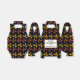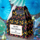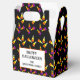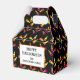 Uma caixa de favores de festas com letras ditas de ouro lendo 'Feliz Halloween', e espaço para seu nome ou mensagem embaixo, em um padrão colorido de milho doce de Halloween em amarelo e laranja.