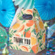 Uma pequena caixa de favor com uma vibração retrorreflectora. Um padrão composto por laranjas fatiadas, laranjas inteiras, folhas verdes e flores brancas.