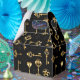 Padrão perfeito de chaves antigas, douradas e silhuetas em fundo preto.