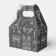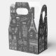 O padrão de caixa de favores brancos/caixa de padaria pequena apresenta o melhor da vida em Paris, desde a Torre Eiffel e Arc de Triomphe até assentos de bistrô e macarões. Rabiscos brancos sobre fundo de cinza de quadro-negro.