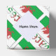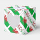 A bandeira galesa com a palavra WALES abaixo, nas cores da bandeira. Esta design é feita para um olhar artístico numa caixa de favores quadrada com um corte de coração na frente. Um fractal branco de quadrados rabugentos tem um lugar para o seu nome. Adicione o seu nome a um toque personalizado ou a uma aparência personalizada. A bandeira é verde e branca com um dragão vermelho.