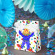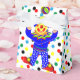 Um palhaço de circo giro sentado numa caixa de favor branca de bolinhas brilhante. Ideal para festas infantis, não se esqueça de personalizar o texto com seus detalhes.