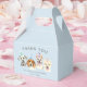 Caixa de favor para a festa de aniversário do tema de filhotes do seu filho. Ilustração de 4 cães (dalmaciano, beagle, pit bull terrier) com chapéus de festa. O texto diz: "obrigado-te por vir ao meu puto." Personalize este produto adicionando o nome do seu filho na parte inferior do design.