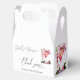 Elegantes Flores de Jardim com Copo de vinho espumante, Frutas Vermelhas e texto "Pétalas e Prosecco" Caixa de Lembrança temática floral para Chá de Noiva em tons de lilás, lavanda, rosa, pêssego, damasco e verde.