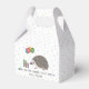 A ilustração original do desenho de Destei de um lindo animal africano Pygmy Hedgehog. O ouriço é fotografado de lado e ele está segurando balões coloridos de aniversário em sua boca. Há também dois presentes colocados em frente ao ouriço. Uma caixa atual é roxa e a outra é verde-lacrimejante. Ambos os presentes estão embrulhados com fita amarela. O fundo tem um padrão de confete pastel colorido sobre um fundo branco. Há também uma área de texto personalizável.
