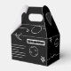 Complemente sua festa de aniversário espacial com caixas bonitinhas para os pequenos. As caixas são pretas com alguns elementos da espaçonave que aparecem nos controles. Na frente, há uma ilustração de uma tela de uma espaçonave com as informações que você pode personalizar. Ilustrada e projetada por Patricia Alvarez.
