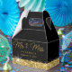 Elegante negro e Dourado Glitter "Sr. & Sra." Caixa de Favoritos do Partido de Casamento, chá de panela ou aniversário com sobrenome personalizado e data de casamento ou aniversário impressa na caixa do minijogo.