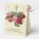 Esta é uma bela caixa de favor para a Primeira Comunhão Sagrada. Tem um belo spray de rosas vermelhas e cor-de-rosa com lírios do vale. Há um crucifixo de ouro na parte de trás da caixa. O fundo é um design de renda de uma nave. Todos os textos e fontes podem ser personalizados.