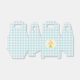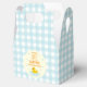 Um pato sortudo! Primeiro aniversário com pato de borracha e bolhas contra gingham azul claro e fundo amarelo pálido com texto laranja