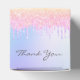Elegante, clássico, glamouroso e feminino para uma Quinceañera, favores de festa de aniversário 15. Um fundo tenso e arco-íris colorido em cor rosa, roxo, ouro rosa e verde de menta. Com o texto: Quinceañera e Obrigado, escreveram com um moderno estilo escrito à mão. Decorado com pingos de brilho sujo, pingando tinta olha em ouro roxo, rosa e rosa. Personalize e adicione um nome e uma data. Texto colorido da cinza.