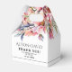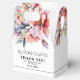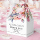 This wedding favor box displays a rhododenron branch with peach-pink flowers and sage green leaves. The couple's names are elegantly displayed in decorative typography. A 'Thank You' message is also included, expressing gratitude to the guests. Completing the look, a stylish black thin line adds a touch of sophistication at the bottom of the box.