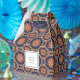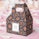 Caixa de pequenos favores com um padrão repetitivo de elementos decorativos de ornamentados em forma de flor, estrela e sol.