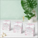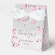 Lindas flores de cerejeira rosa em um fundo de brilho prateado. Caixa de lembrancinha botânica fofa com texto de agradecimento e nomes personalizados do noivo e da noiva e data do casamento.